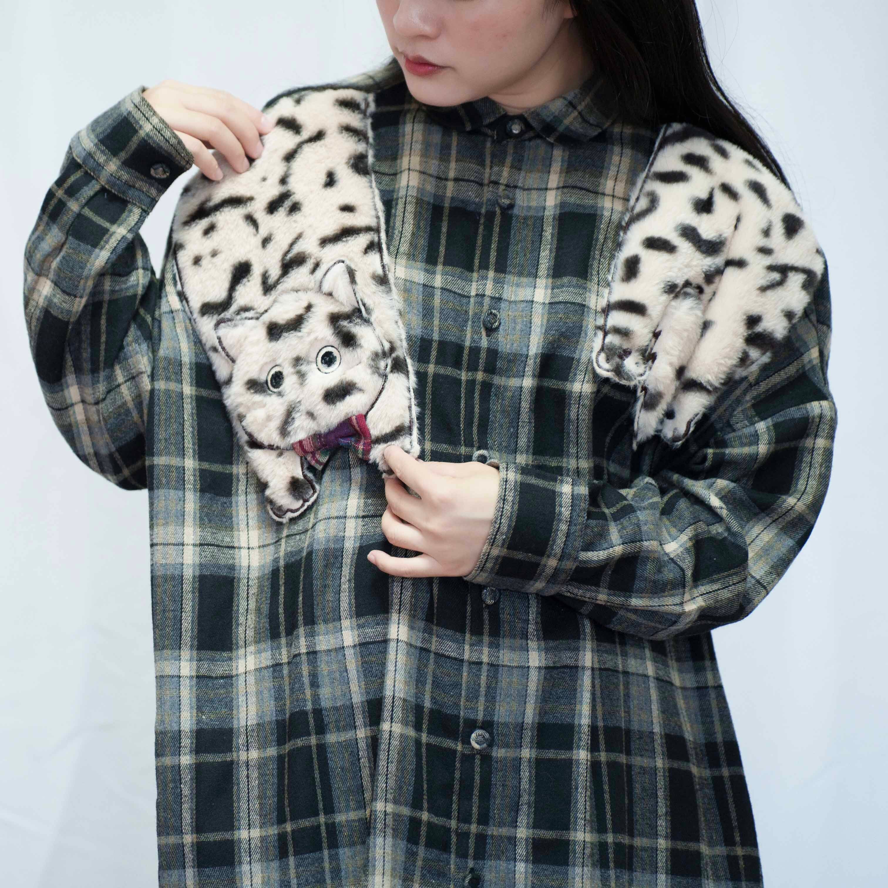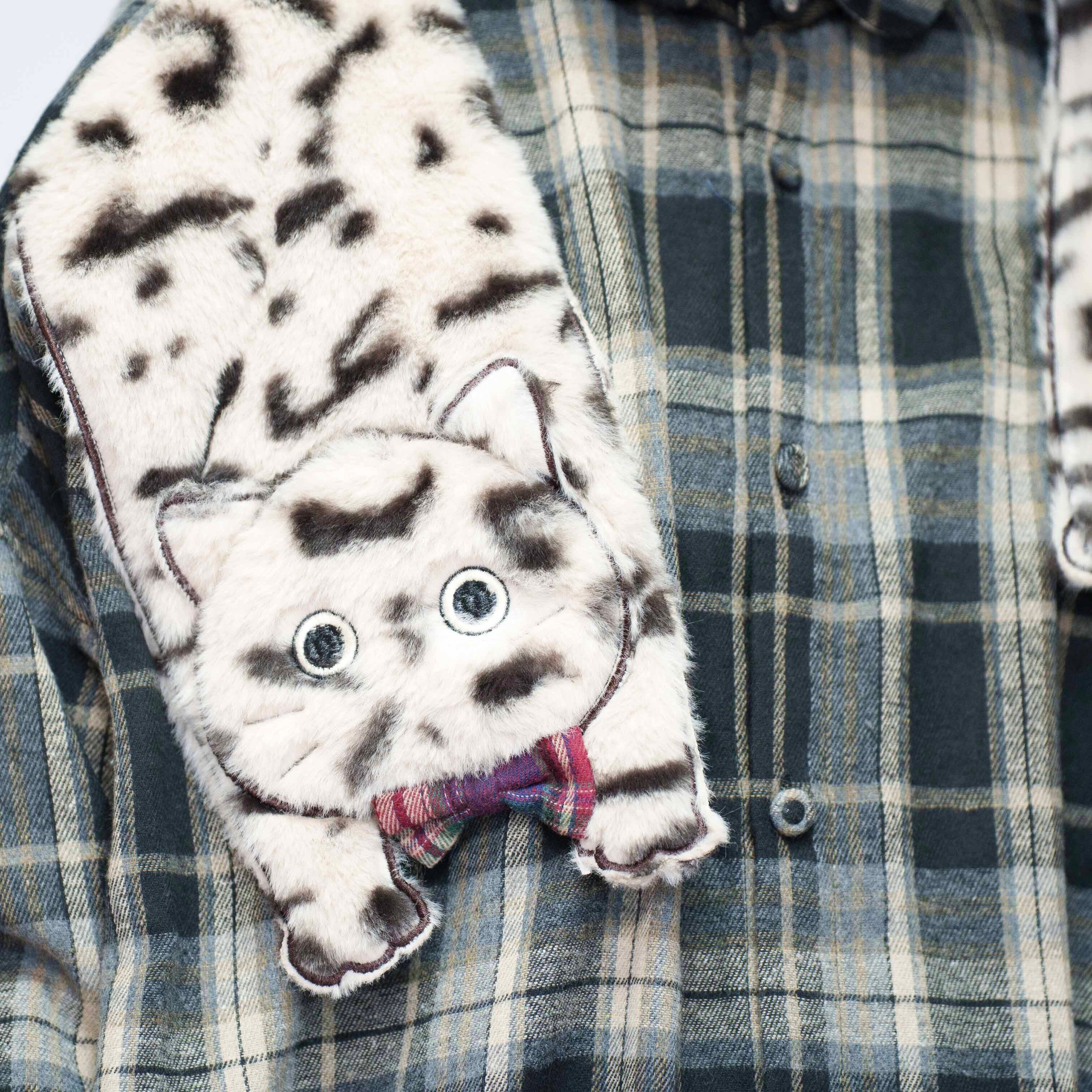 ふわふわ猫が肩にぶら下がっているイメージの刺繍の