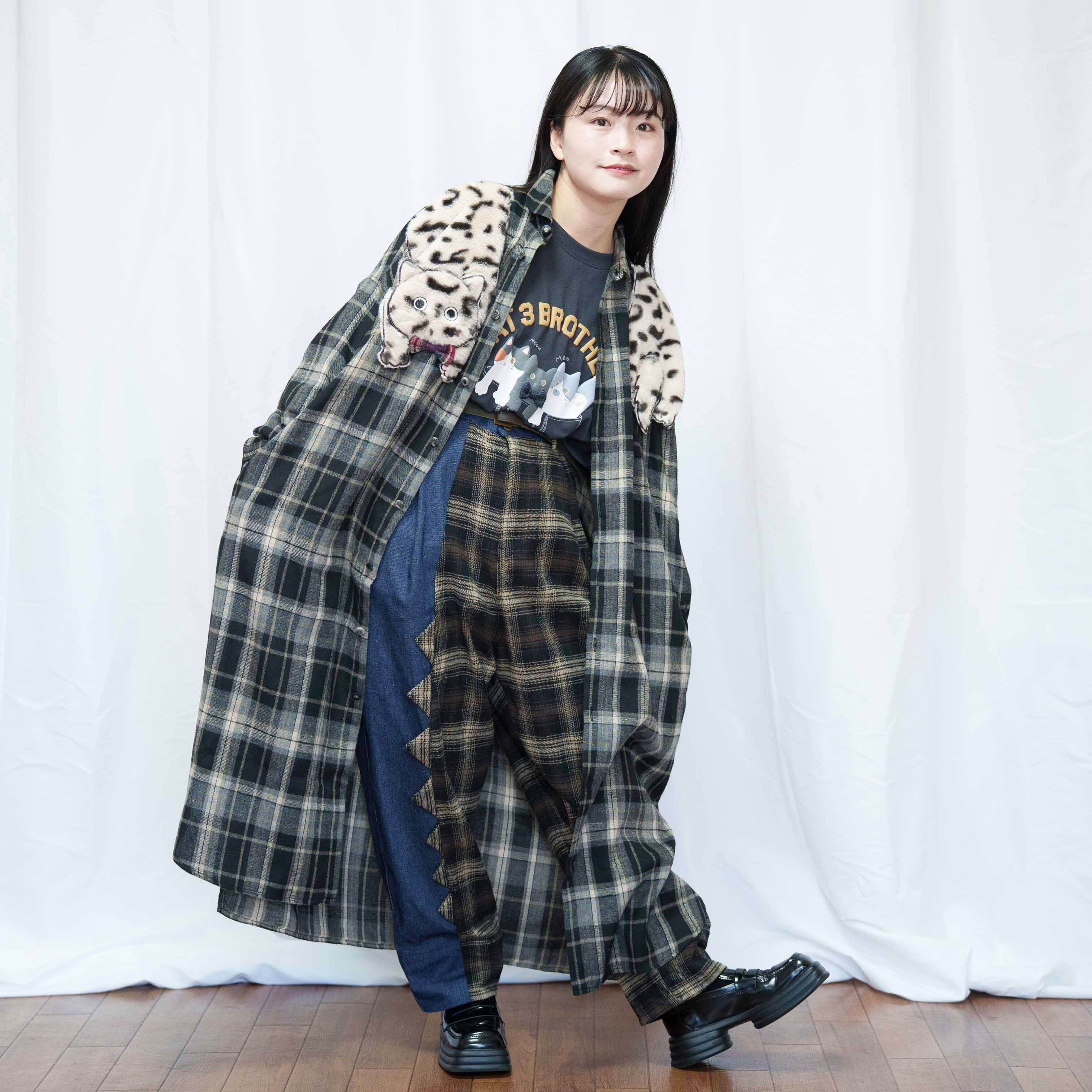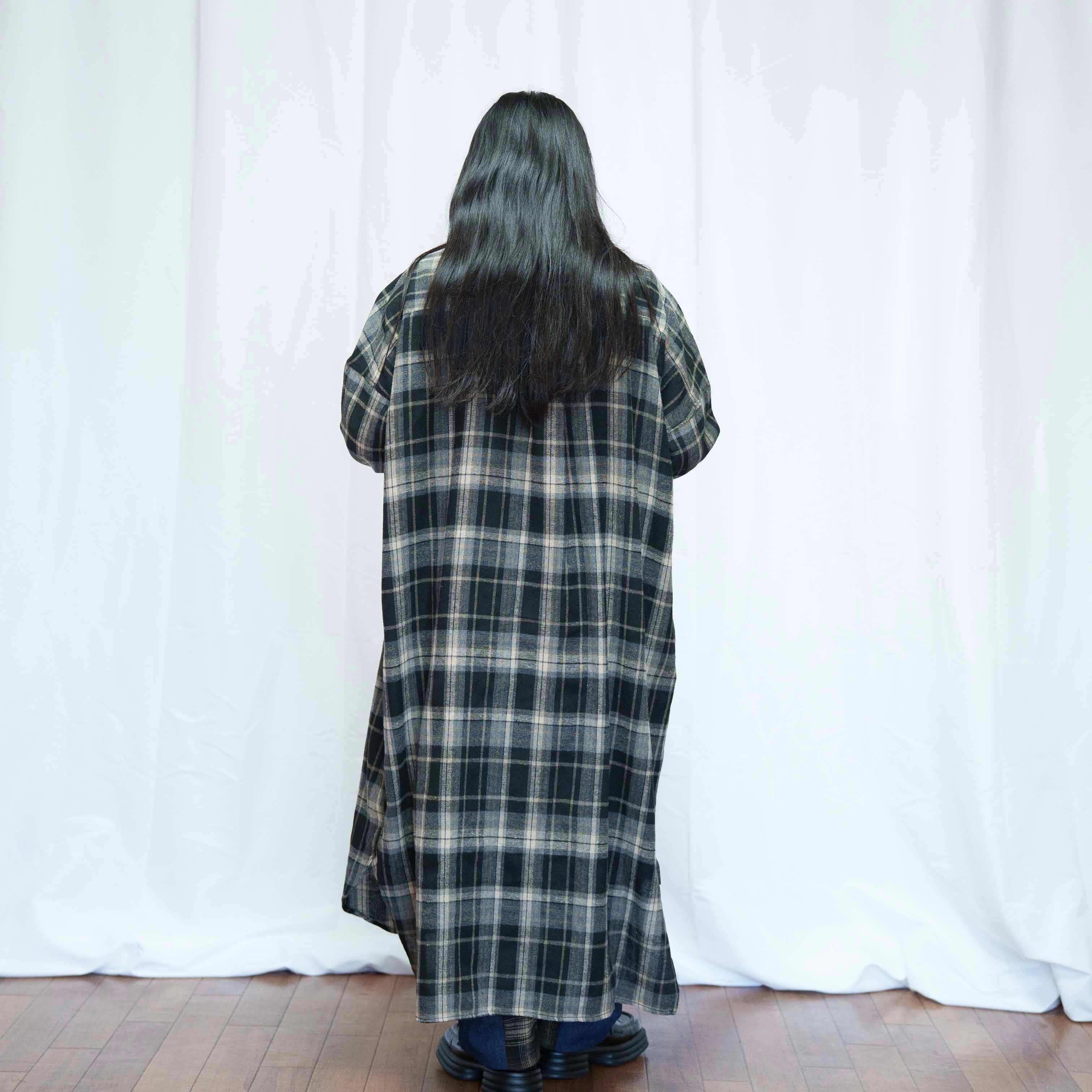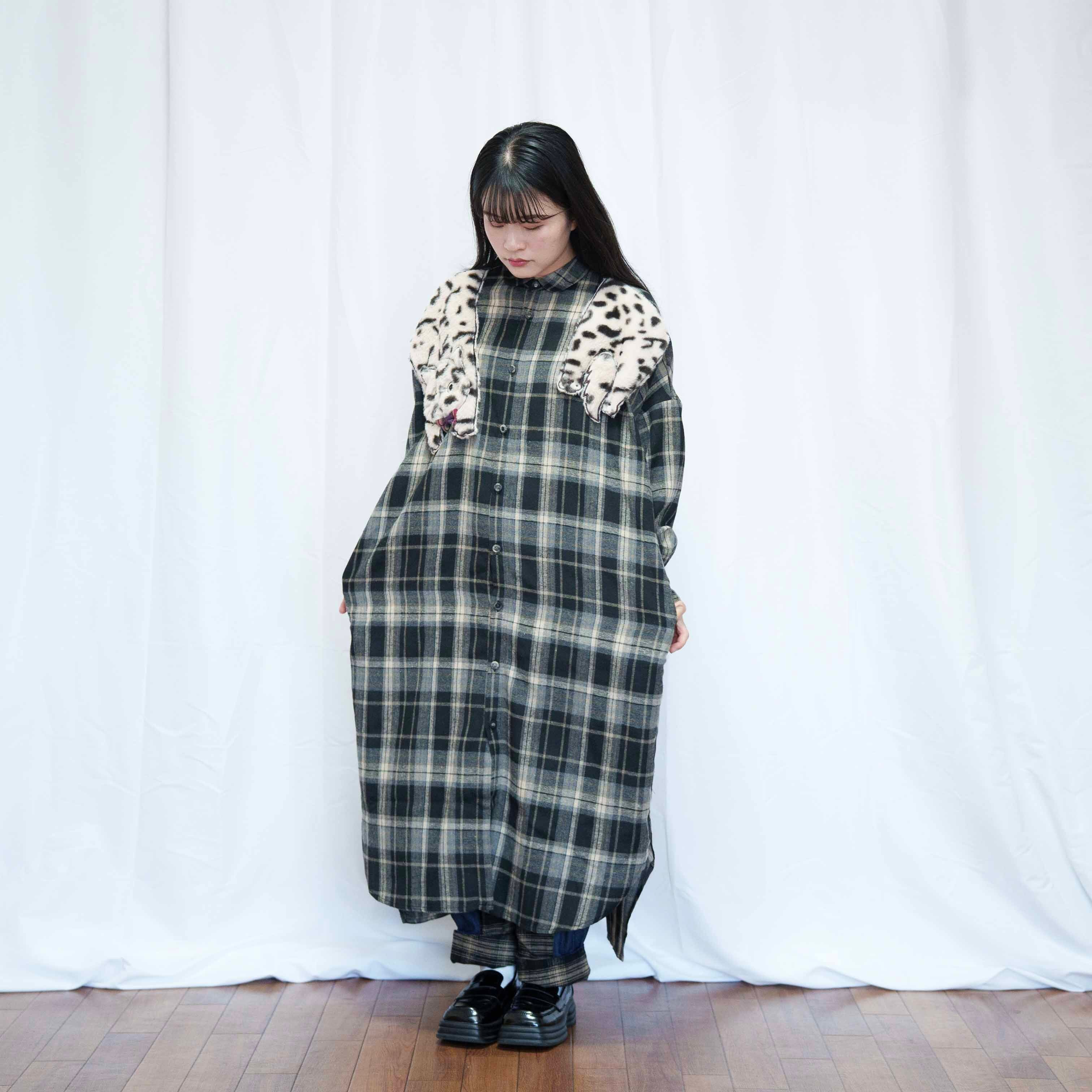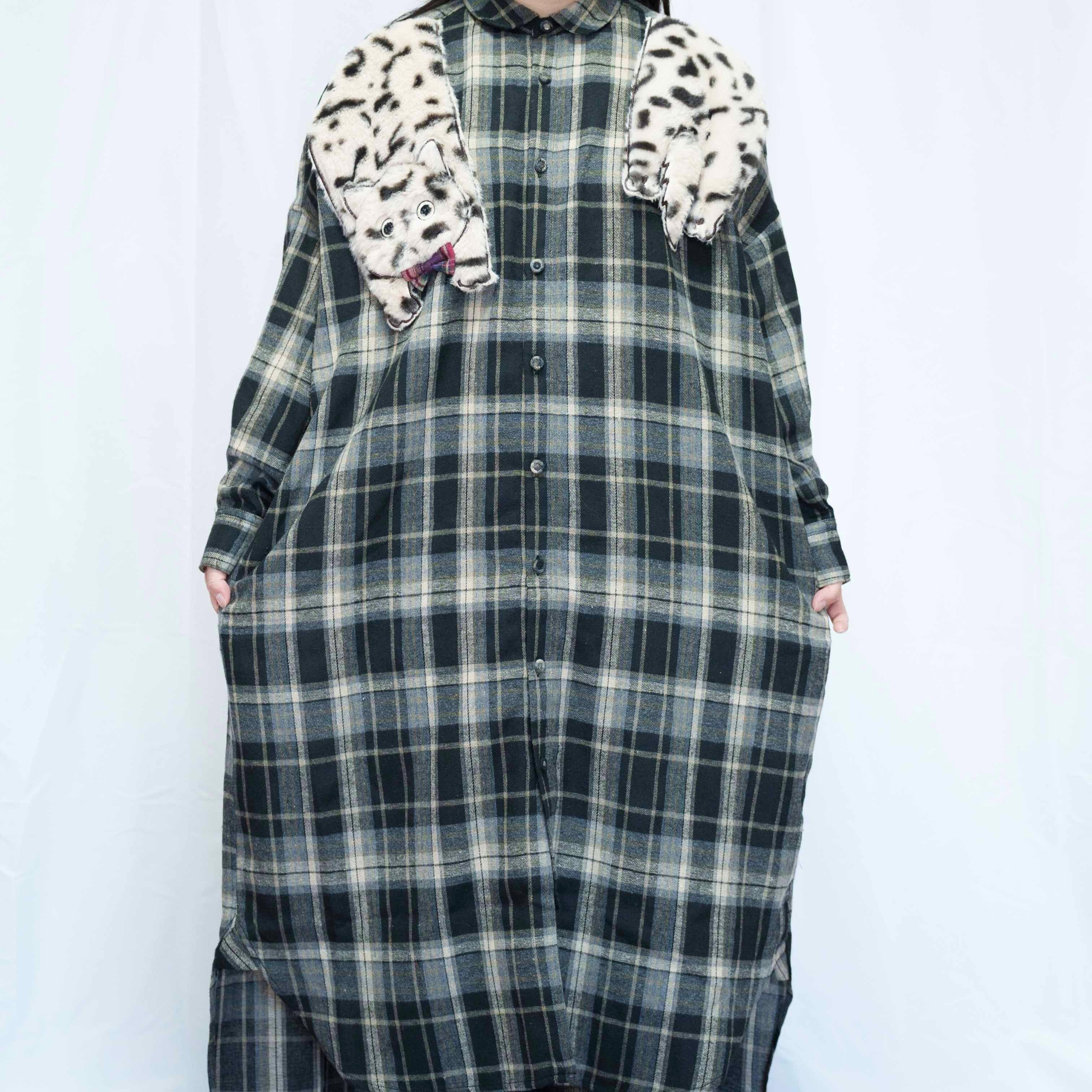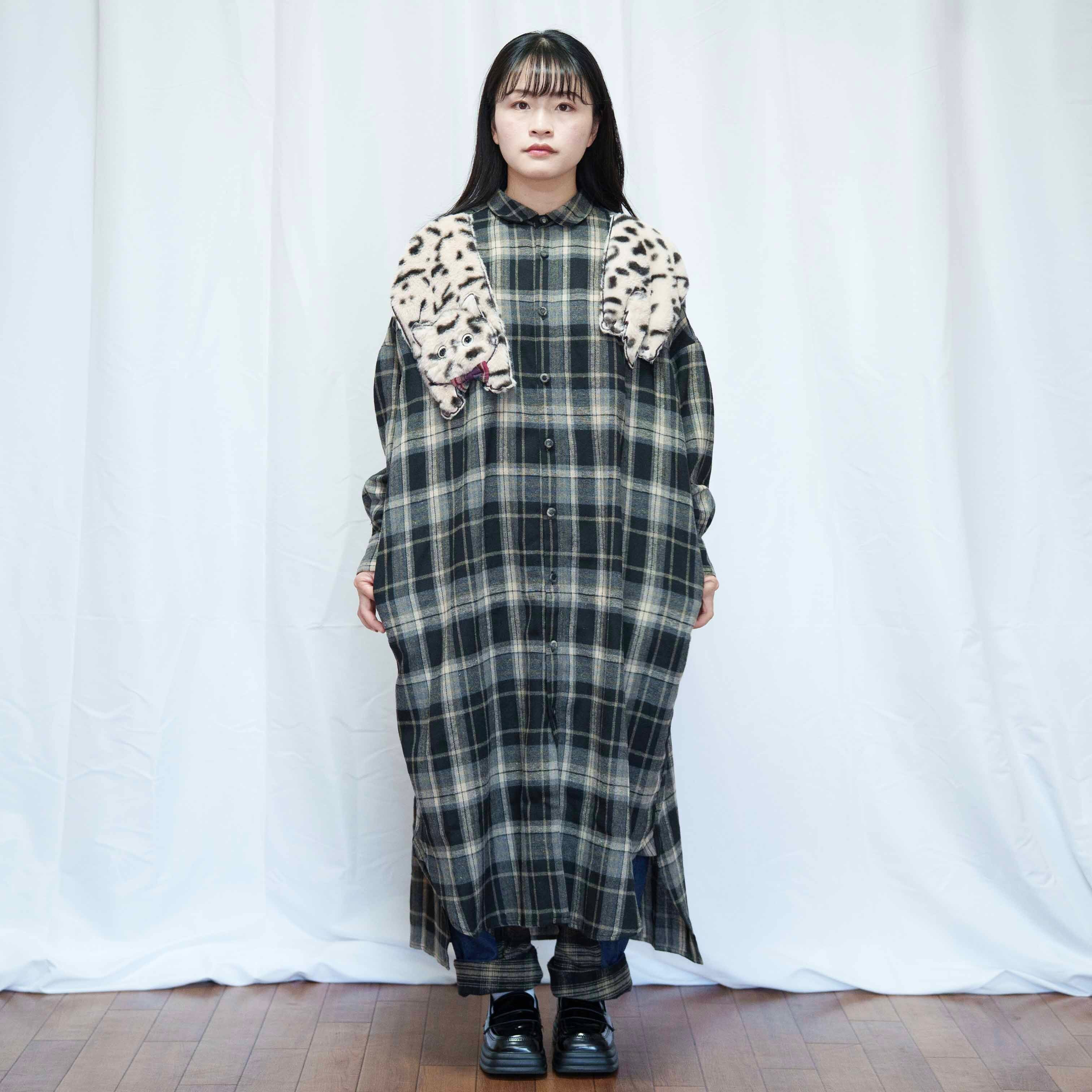 ねこぶら下がりモチーフ ブラウンチェック シャツワンピース(商品NO.450070)