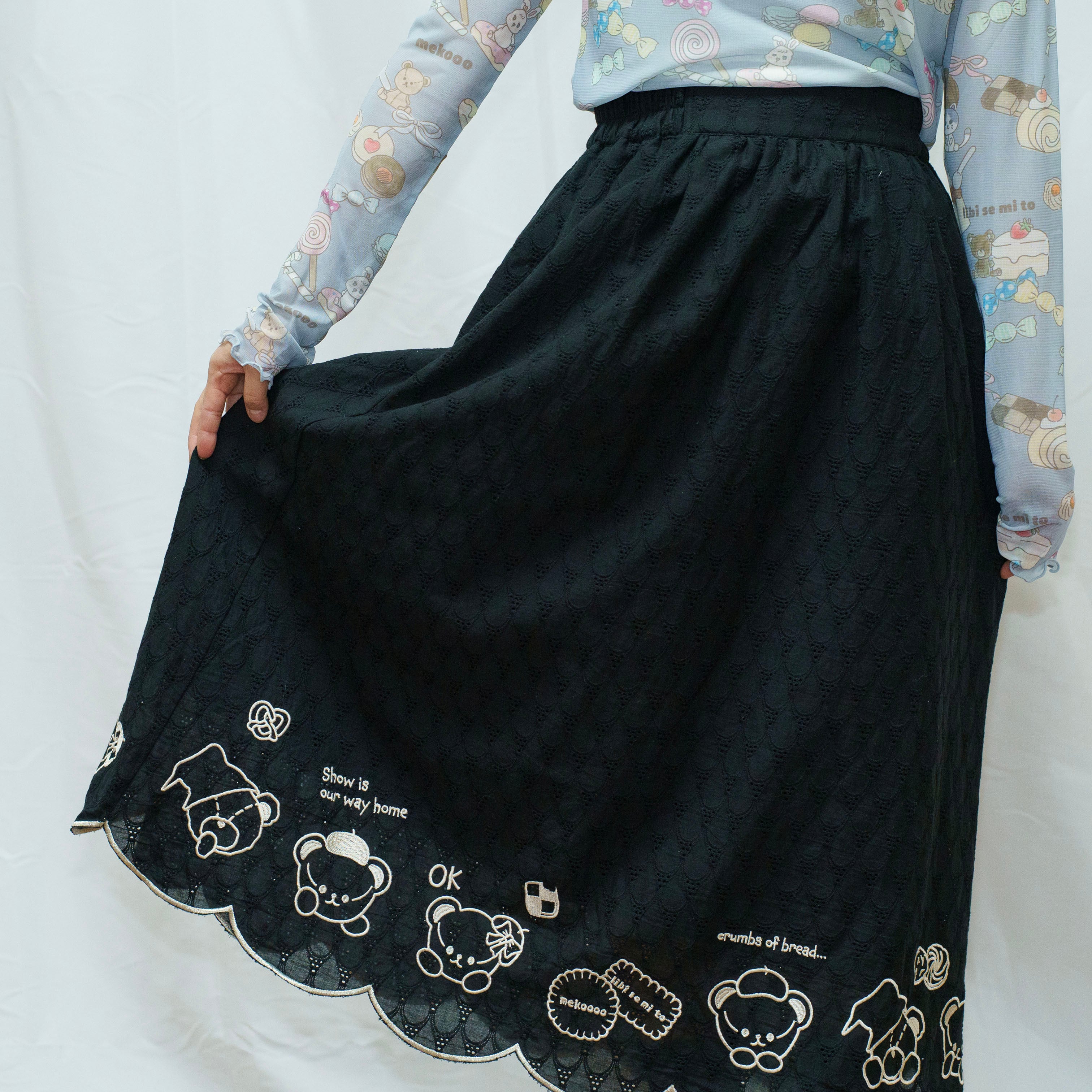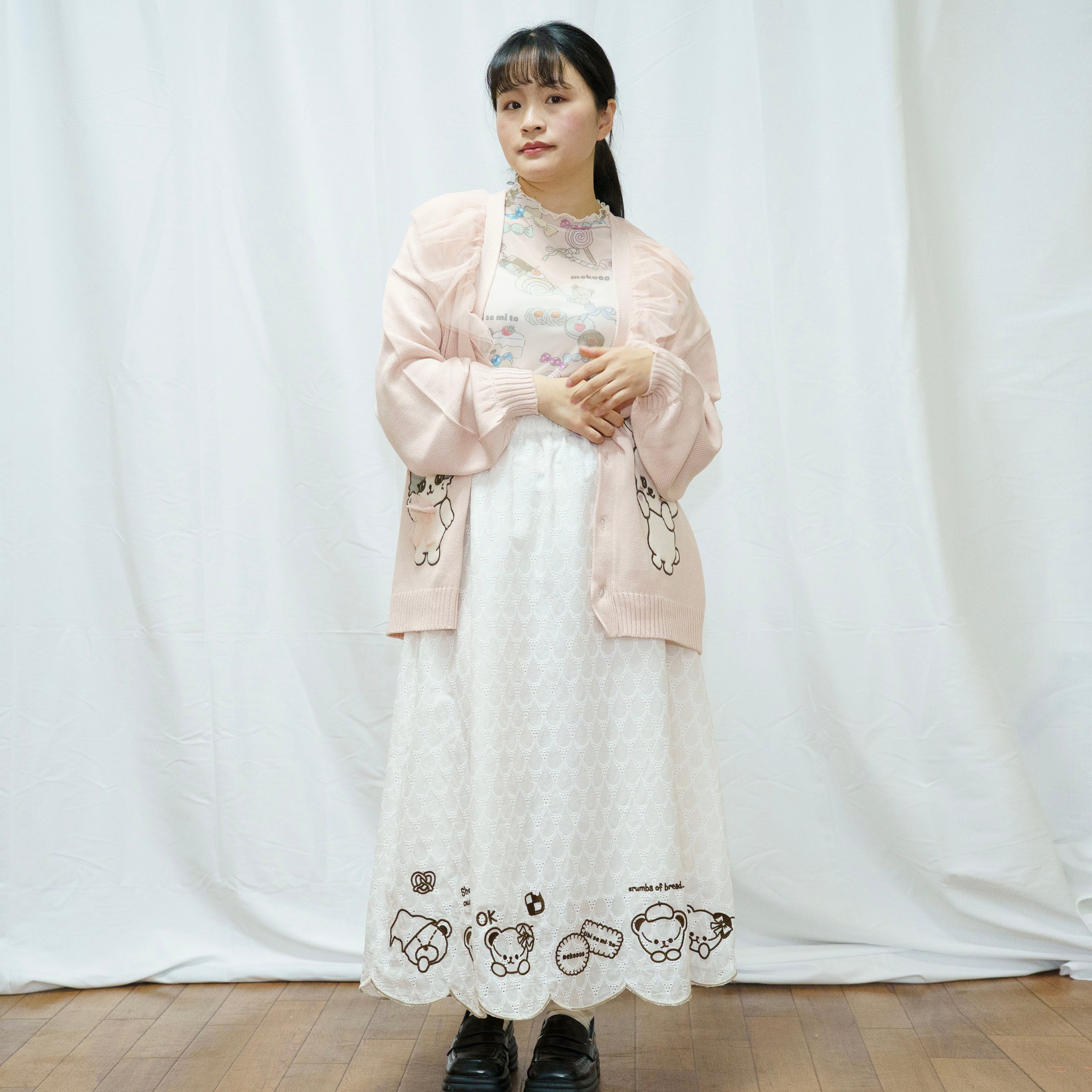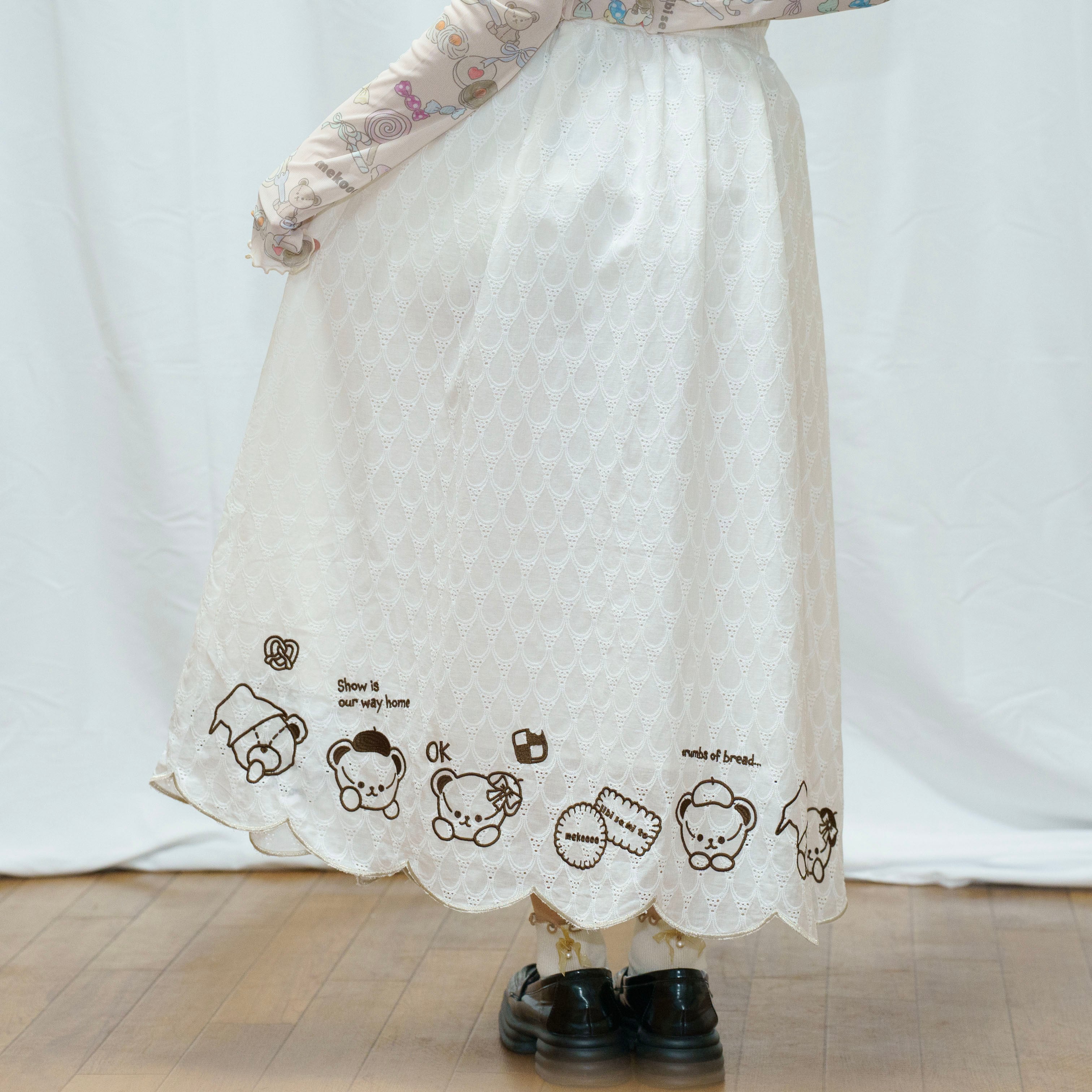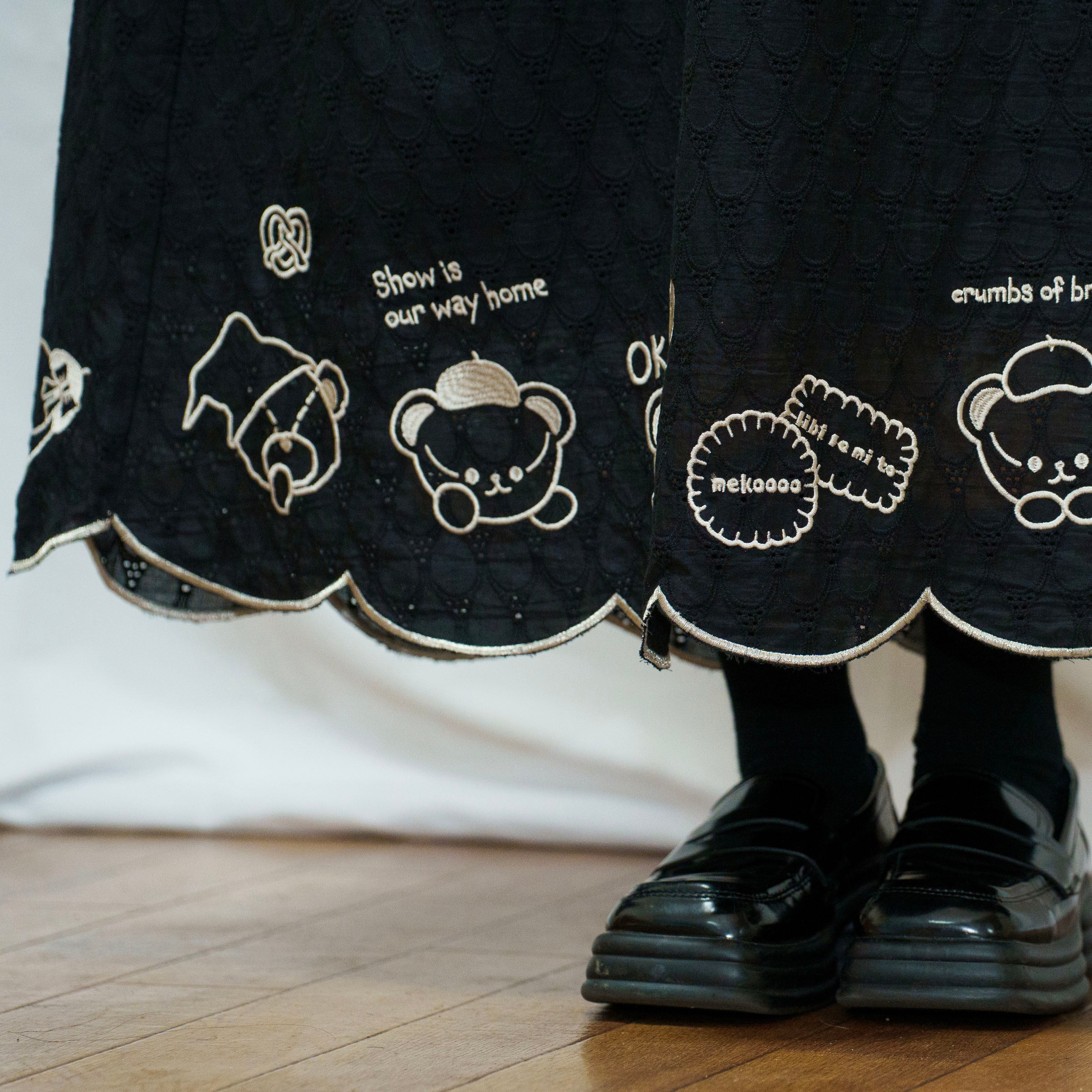 裾のスカラップデザインにキャラクターたちの刺繍
