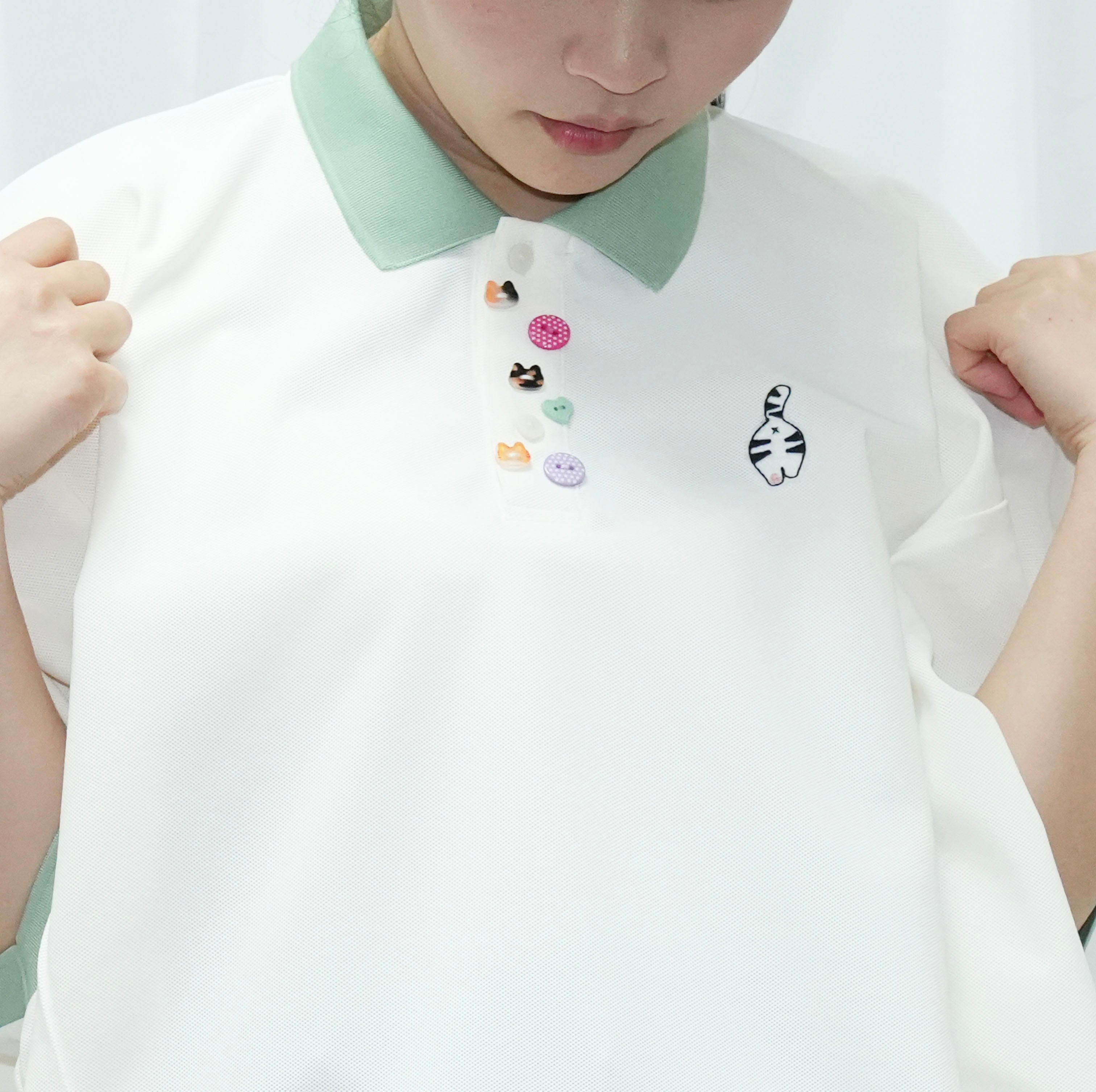 たくさんの釦モチーフとねこのお尻刺繍がポイントです。